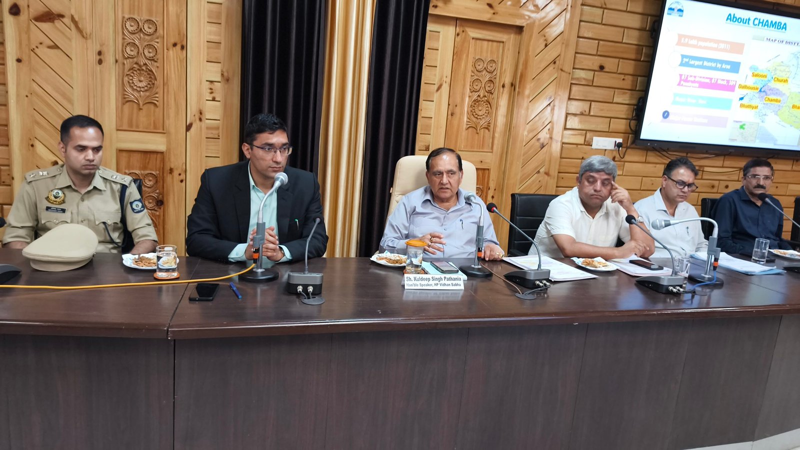 Assembly Speaker Kuldeep Singh Pathania has directed the development of a special Standard Operating Procedure (SOP) for the safety and convenience of pilgrims ahead of the upcoming Shri Mani Mahesh Yatra. He also directed the concerned departmental officials to prepare and submit an action plan to the state government for a long-term solution to the problem of soil erosion from rivers, streams, hydroelectric project reservoirs, along National Highway 154-A, various connecting roads, villages, and populated areas. The Assembly Speaker was presiding over a meeting held at the Savings Building to review the damage caused by natural disasters in the district during the ongoing monsoon season. MLA Neeraj Nayyar was also a special guest at the meeting. After conducting a detailed review of the damage caused by natural disasters, Kuldeep Singh Pathania issued necessary instructions to the concerned officials, stating that a special Standard Operating Procedure should be developed prioritizing infrastructure, medical and communication services, transportation, and disaster management for the safety and convenience of pilgrims ahead of the upcoming Shri Mani Mahesh Yatra. He stated that, according to departmental data, the Public Works Department, Water Power, Electricity Board, Agriculture and Horticulture, National Highways, and other departments in the district will have to spend more than four times that amount to rebuild projects worth ₹710 crore. The Speaker directed all concerned departmental officials to effectively curb illegal dumping in rivers, streams, and areas with sensitive ecosystems. The Speaker also commended the district administration for its relief and rehabilitation measures during the monsoon season, as well as for the safety and convenience of pilgrims on the Mani Mahesh Yatra. MLA Neeraj Nayyar urged the immediate resumption of work under the Rajiv Gandhi Forest Conservation Scheme to address soil conservation issues in rural areas and the restoration of rural connectivity. Congress leader Yashwant Khanna from Churah constituency raised the issue of rehabilitation of disaster-affected people. Deputy Commissioner Mukesh Repaswal earlier presented a detailed account of the damage caused by natural disasters in the district through a presentation. He stated that 957 homes in the district have been damaged during the ongoing monsoon season. Of these, 39 kutcha and 51 pucca homes have been completely damaged. Another 781 kutcha and pucca homes have been partially affected. Immediate relief funds of ₹1.8 million have been provided to affected families so far. He also shared information about the steps taken by the district administration for relief and rescue operations and rehabilitation. Superintendent of Police Abhishek Yadav, Chief Forest Range Officer Rakesh Kumar, Additional District Magistrate Amit Mehra, Sub-Divisional Magistrate Civil Priyanshu Khati, Chief Medical Officer Dr. Vipin Thakur, Medical Superintendent Pandit Jawaharlal Nehru Government Medical College Dr. J.S. Bhardwaj, Superintending Engineer Diwakar Pathania, Rajesh Mogra, Rajiv Thakur, and various departmental officials were present at the meeting.