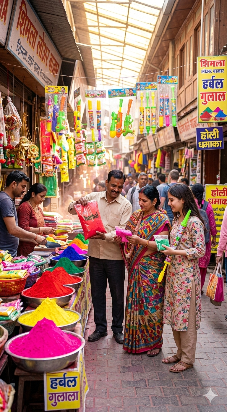 शिमला के मुख्य बाज़ारों में होली की खरीदारी ज़ोरों पर है। लोअर बाज़ार में लोग रंग-बिरंगे गुलाल और बच्चों के लिए कार्टून वाली पिचकारियां खरीदते नज़र आ रहे हैं। इस साल लोग अपनी त्वचा (skin) का खास ख्याल रख रहे हैं, इसलिए हर्बल और प्राकृतिक रंगों की मांग सबसे ज़्यादा है।
