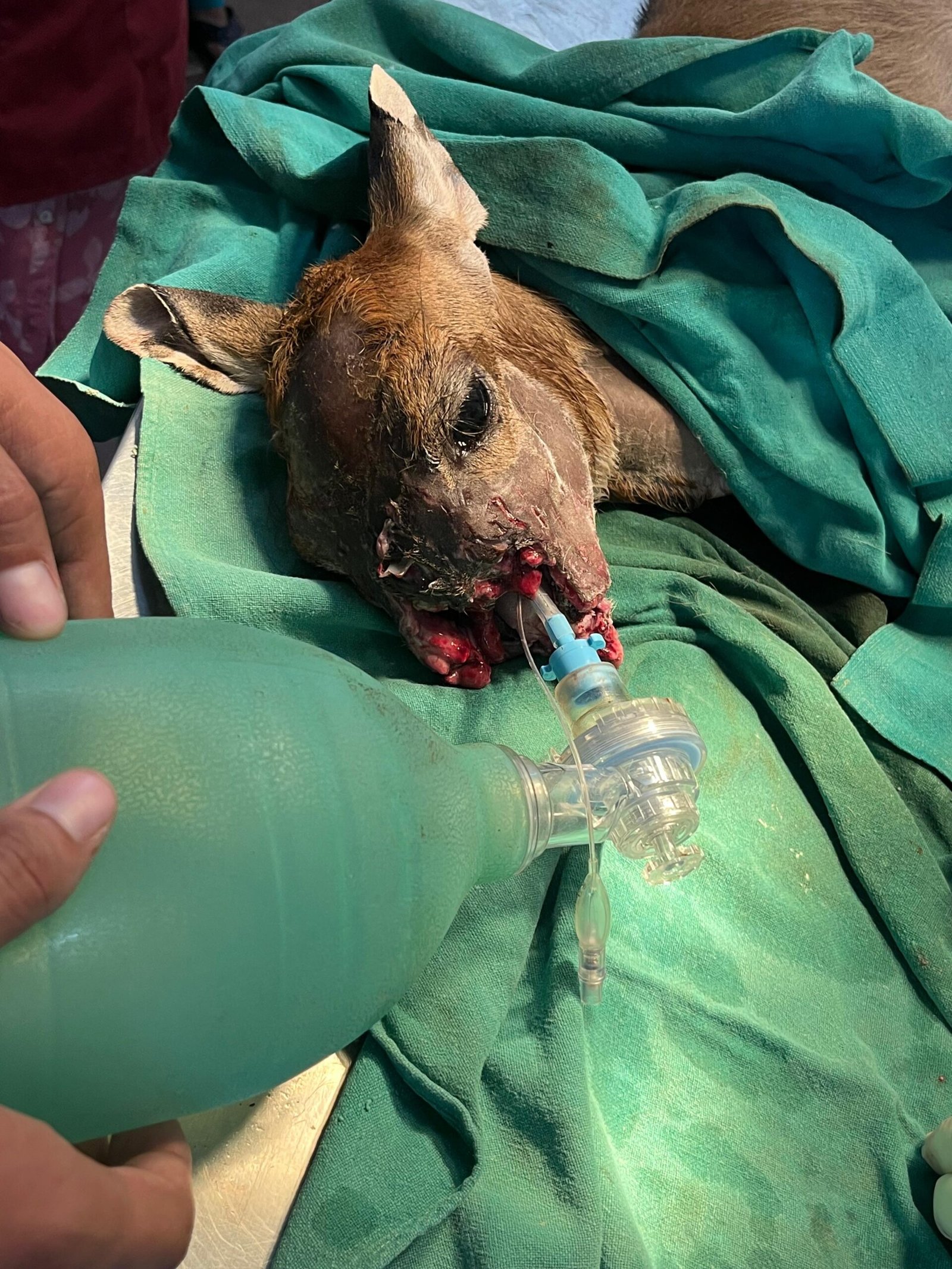 डॉ. मनोज शर्मा ने बताया कि घायल सांभर ऊना के आसपास के जंगलों में पाया गया था। किसी जंगली जानवर द्वारा हमला किए जाने से उसका पूरा जबड़ा, दांतों सहित हड्डियां भी बुरी तरह से क्षतिग्रस्त हो गई थीं। स्थानीय लोगों की सूचना पर वन विभाग ने त्वरित कार्रवाई करते हुए राधा माधव गौशाला की मदद से इस घायल जानवर को बहुआयामी पशु चिकित्सालय, लालड़ी में लाया। स्थिति की गंभीरता को देखते हुए, डॉ. शर्मा ने इसे आपातकालीन स्थिति घोषित करते हुए तत्काल प्लास्टिक सर्जरी का निर्णय लिया। अत्यधिक रक्तस्राव और श्वसन अवरोध के चलते यह सांभर जीवन और मृत्यु के बीच झूल रहा था।